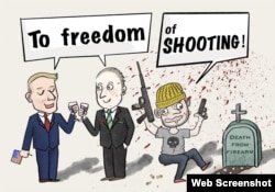 Like Valiant Panda, the Xinhua cartoons do not stop at foreign policy parody, they often exploit societal concerns and tragedies, like mocking the issue of gun violence that grips American cities.