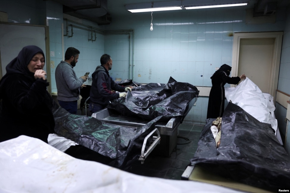 People look at bodies, believed to be of prisoners from Sednaya prison, according to forensic official Zaher al-Taqesh, at the Al Mojtahed hospital, after rebels seized the capital and ousted Syria's Bashar al-Assad, in Damascus, Syria, Dec. 10, 2024.