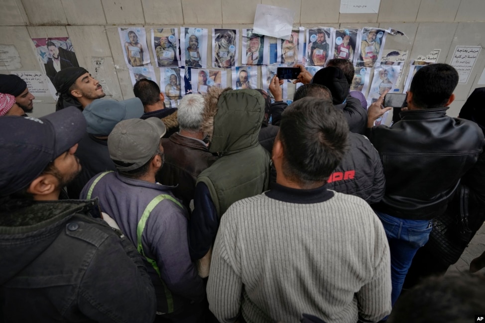 People examine photos as they search for missing or deceased people on the wall outside the morgue of Al-Mojtahed Hospital in Damascus, Syria, Dec. 11, 2024.