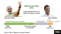While celebrations continued nonstop for the BJP, the New Delhi headquarters of the Congress Party wore a desolate look. Congress Party leaders conceded defeat early. The “grand old party,” which has ruled India for more than 50 years, was not just voted out - it was decimated. That is likely to raise questions about its continued reliance for leadership on the Gandhi political dynasty.