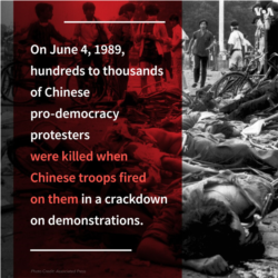 Thirty-two years ago, thousands of pro-democracy protesters took to the streets in Beijing demonstrating against the Chinese government and demanding economic and political reforms. After several weeks, China's People's Liberation Army occupied the area with tanks and opened fire against the student-led demonstrators, killing an unknown numbers of demonstrators.