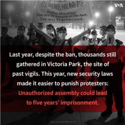 Social media posts showed how individuals had attended the park the day before, on June 3, to show their respects. At Hong Kong University, a ceremony took place around Pillar of Shame of Hong Kong — a concrete sculpture depicting 50 twisted bodies as a representation of those who died during the Tiananmen Square protests. Others have told VOA they plan to attend Remembrance Mass, an event to commemorate the crackdown in churches across the city.