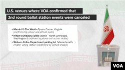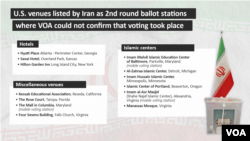 That first-round operation suffered some setbacks, according to an initial VOA investigation. Three of the 33 ballot station addresses listed online by the interests section office just hours before voting started quickly canceled their voting events under pressure from Iranian American activists and protesters who oppose Iran’s authoritarian Islamist rulers.