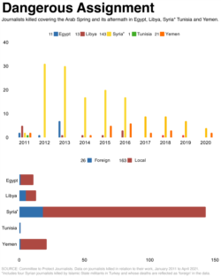In total, 189 journalists from those five countries were killed either covering the initial protests or reporting on the resulting unrest and conflict that persisted for the past 10 years, according to data by the Committee to Protect Journalists.