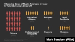 Using open source records, Kurzman has identified 414 Muslim Americans who have been involved in extremist plots in the U.S. since 9/11. Among them were 217 natural-born citizens, 60 naturalized citizens, 39 legal permanent residents, 38 refugees and 15 undocumented immigrants.