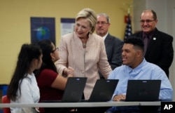 Democratic presidential candidate Hillary Clinton talks with students as she tours classrooms at John Marshall High School in Cleveland, Aug. 17, 2016, before participating in a campaign event.