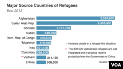 The report said major new displacement also has occurred in Africa, notably in Central African Republic, and South Sudan. Overall, the biggest refugee populations under UNHCR care are Afghans, Syrians and Somalis. They account for more than half of the global refugee total.