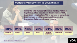 While the U.S. does well regarding three criteria of the gender gap report, “the political representation of women in this country is abysmal,” Keshet Bachan, a girl's empowerment expert in Washington, D.C., told VOA.