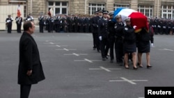 French President Francois Hollande stood before the flag-draped coffins and praised their heroism, granting the officers posthumously the nation's prestigious Legion of Honor award.