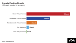 Results provided by Canada's election commission show the Liberals winning 184 seats in the 338-seat Parliament, compared to the 99 seats won by outgoing Prime Minister Stephen Harper's Conservative Party.