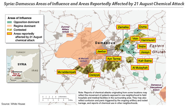 - Assad regime carried out a rocket and artillery attack on the Damascus suburbs early on Aug. 21