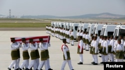 As top leaders, including Malaysian Prime Minister Najib Razak, looked on, the coffins, draped in Malaysian flags, were carried by teams of eight soldiers to individual hearses.