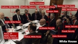 The next meeting was in a secure room at the president's Mar-a-Lago resort, shortly after his state dinner with the Chinese president. A photo released by the White House shows 15 top Cabinet officials and advisers around a small table for a briefing on results of the strike.