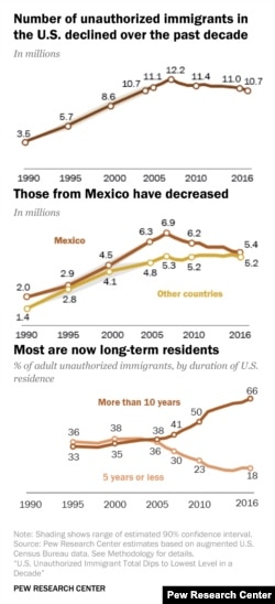 And while the U.S.-Mexico border has been the focus of the Trump administration and the media in recent weeks, Pew said most unauthorized immigrants enter the U.S. on legal visas and remain after their visas expire.