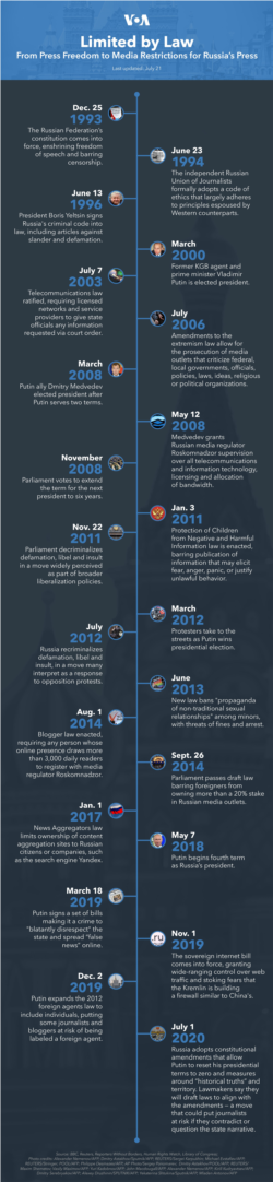 Gulnoza Said, head of the CPJ’s Europe and Central Asia program, told VOA she doubted Moscow would change course after the constitutional vote. “The Kremlin is not likely to ease its policy of suppressing independent media,” she said.