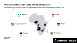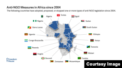 In a dozen countries across Africa, governments have enacted laws or policies that "improperly constrain" nongovernmental organizations and imperil civil society, the democracy watchdog Freedom House says in a new report.