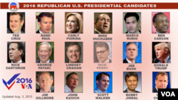 Also fighting for time in the debate spotlight were Kentucky Senator Rand Paul, Texas Senator Ted Cruz, New Jersey Governor Chris Christie, Wisconsin Governor Scott Walker, Ohio Governor John Kasich, ex-Arkansas Governor Mike Huckabee, and retired neurosurgeon Ben Carson. Carson has been polling second in recent opinion surveys.