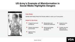 U.S. officials have been aware of the effort for some time. At least as far back as March 2017, a Defense Information School presentation to Army public affairs officers identified disinformation on social media as a high-risk problem, capable of eroding "trust and confidence" in the ranks as well as in the Army as a whole.