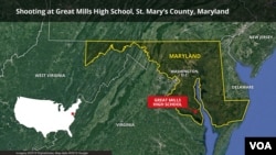The latest U.S. school shooting unfolded as classes were starting at Great Mills High School in St. Mary's County, about 100 kilometers south of Washington. Sheriff Timothy Cameron identified the shooter as 17-year-old Austin Wyatt Rollins and said shots Rollins fired hit a 16-year-old girl, critically wounding her, and a 14-year-old boy. Both were hospitalized.