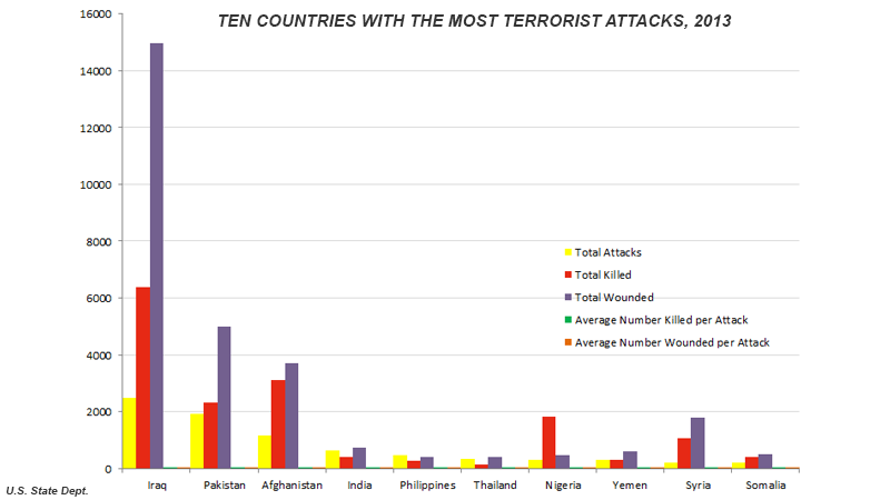 The report says terrorist violence in 2013 was fueled by sectarian motivations, in particular in Syria, Lebanon, and Pakistan, where victims were primarily civilians.