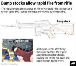 Bump stocks are accessories that replace a rifle’s stock, the part that rests against the shoulder. They harness the gun’s recoil energy so that the trigger bumps against the shooter’s stationary finger, allowing the gun to fire at a rate comparable to a traditional machine gun. Fifteen states and the District of Columbia have their own bans on bump stocks.