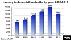 UNAMA said the total casualties for the first half of 2012 include 1,145 civilians killed and 1,954 others wounded. Despite the decline, it said the level of casualties remains "devastating."