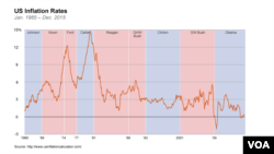 Inflation soared during the administrations of Republicans Nixon and Ford, and rose even higher under Democrat Jimmy Carter. Inflation dropped while Republicans Ronald Reagan and George W. Bush were in the White House, and fell low enough to spark worries about deflation under Obama.