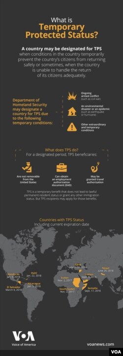 These immigrants are among more than 320,000 from 10 nations who have time-limited permission to live and work in the U.S. under TPS because of war, hurricanes, earthquakes or other catastrophes in their home countries that could make it dangerous for them to return.