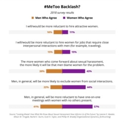 A 2018 survey shows 41% of men say they’re more reluctant to have a one-on-one meeting alone with a woman. And more than one-in-five men say they’re more inclined to exclude women from social interactions like meeting for drinks after work.