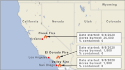 In eastern San Diego County, the Valley Fire broke out Saturday afternoon and fire officials warned the blaze was burning at a "dangerous rate of speed." By Sunday morning it had destroyed at least 10 structures after burning 6.25 square miles (16 square kilometers) and prompting evacuations near the remote community of Alpine in the Cleveland National Forest. At least two of the lost structures were homes, KGTV reported. There was no containment of the fire.