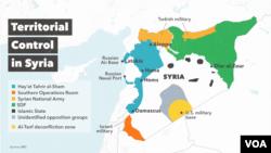 Still holding territory in the northwest is the Syrian National Army, or SNA. Having grown out of the loose coalition of rebel groups known as the Free Syrian Army early in the civil war, the SNA represents both Islamic and secular factions that are directly backed by Turkey and support the so-called Syrian Interim Government based in the town of Azaz.
