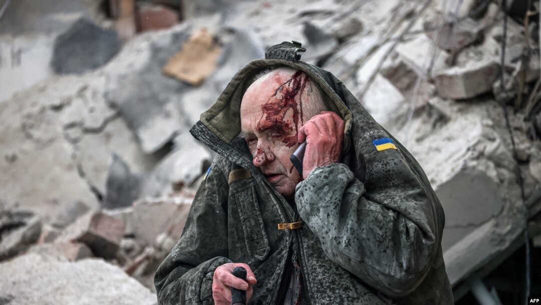 An injured man talks on a mobile phone after he was rescued by emergency workers from a partially destroyed residential building following a shelling in Sloviansk, on April 14, 2023, during the Russian invasion of Ukraine.