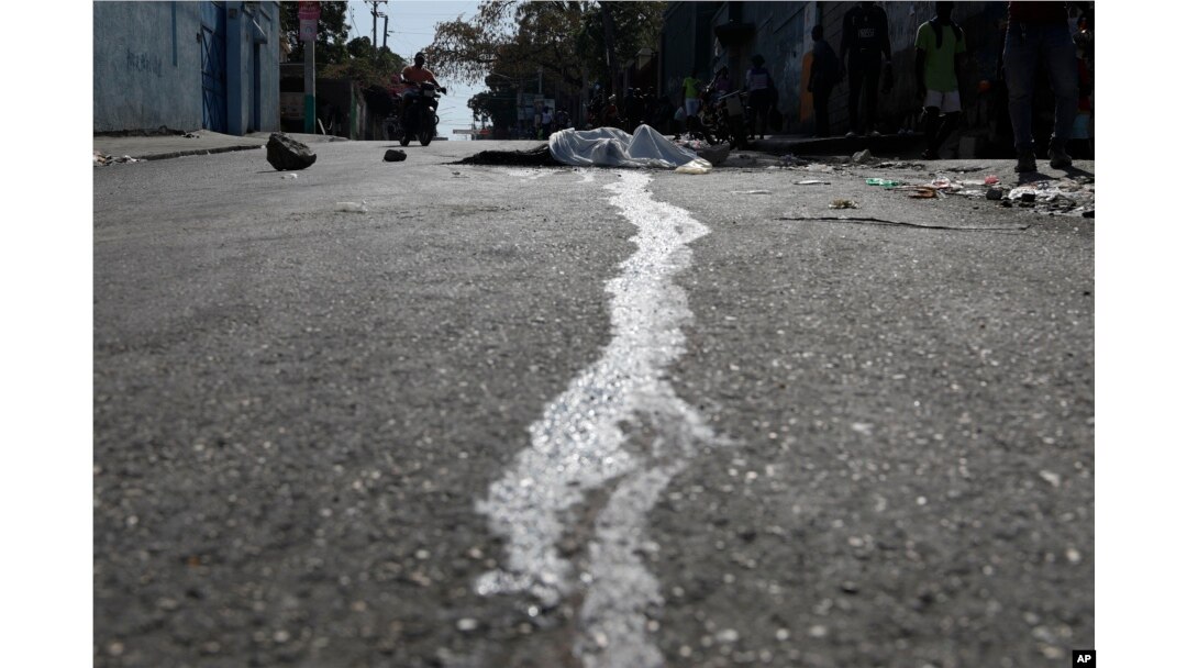Blood streams from a body lying in the street in the Petion-ville area of Port-au-Prince, Haiti, March 20, 2024.