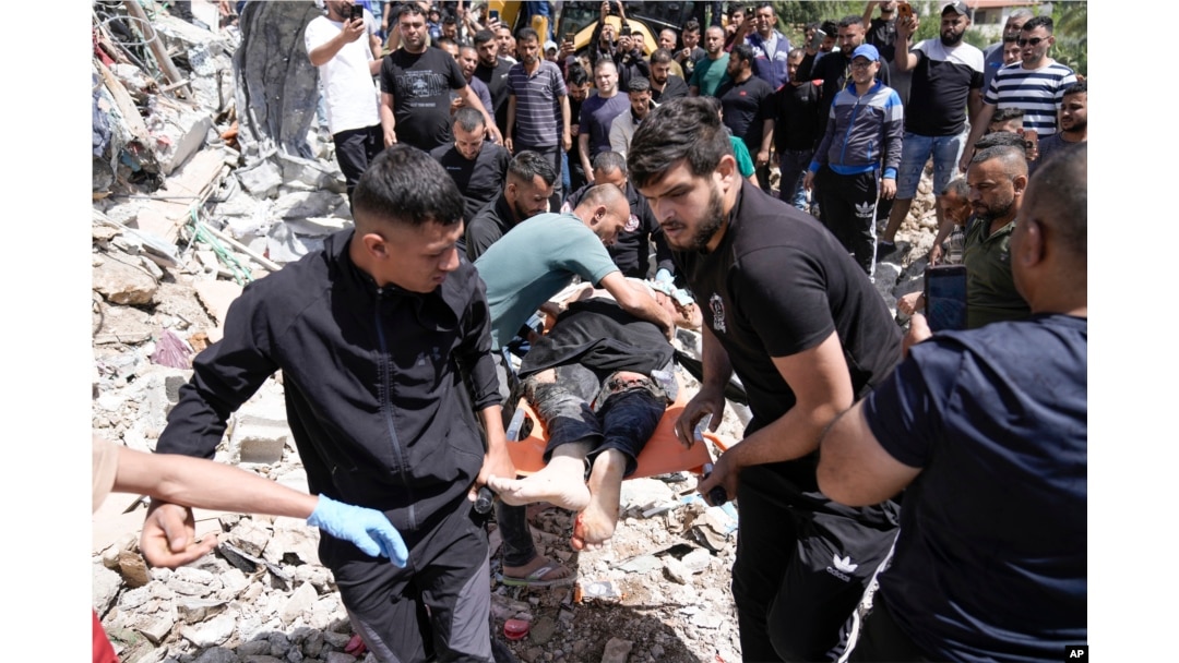 Palestinians remove the body of a man after a military operation in the Palestinians town of Deir al-Ghusun, near the West Bank town of Tulkarem, May 4, 2024.