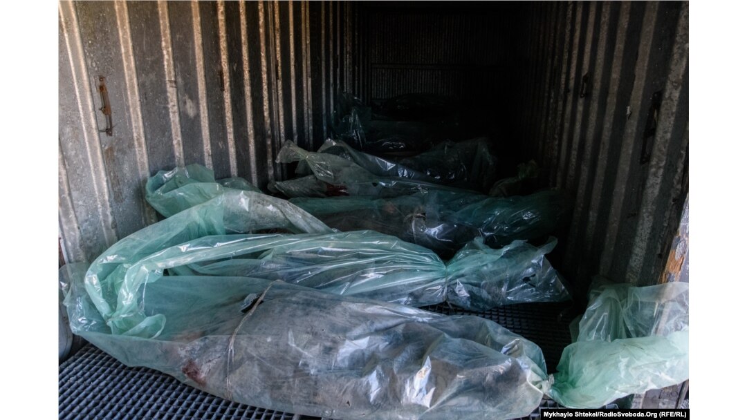 The bodies of 12 dead Russian soldiers in a refrigerator car at the Voznesensk railway station in Voznesensk, Ukraine, March 16, 2022