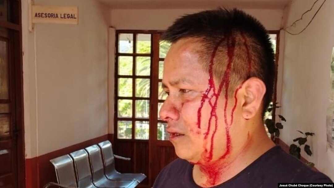 Bolivian journalist Josue Chube Choque received multiple hits to his body and face after being ambushed while covering confrontations between police and protesters in the town of Mairana, Bolivia, on Oct. 29, 2024.