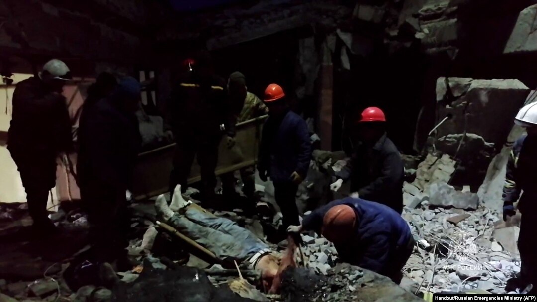 This grab from footage released by the Russian Emergencies Ministry on Feb. 3, 2024, shows rescuers removing victims and searching for survivors inside a bakehouse hit by shelling in Lysychansk. AFP PHOTO / Russian Emergencies Ministry