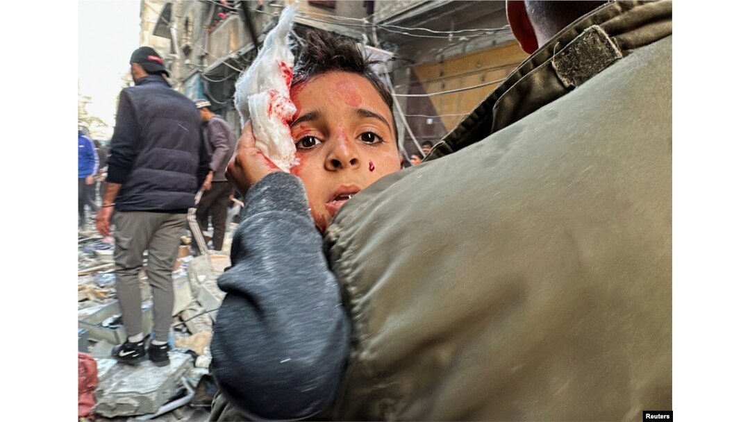 A Palestinian carries a wounded child at the site of an Israeli strike on an apartment building in Nuseirat, Gaza Strip, on Dec. 20, 2024.