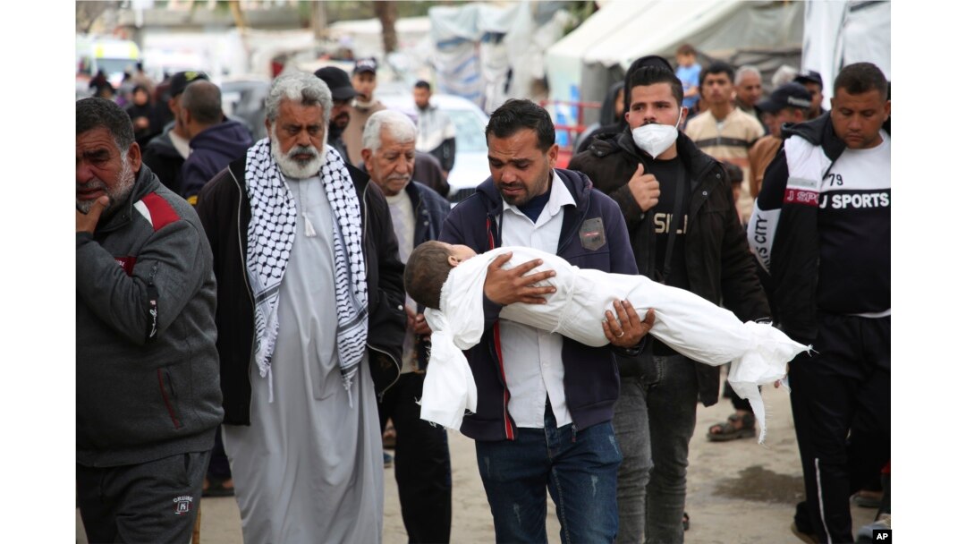 Mohsen Muammar carries the body of his 3-year-old son Muhammad, who was killed in the Israeli bombardment of the Gaza Strip, to his family house to bury him in Rafah, on March 29, 2024.